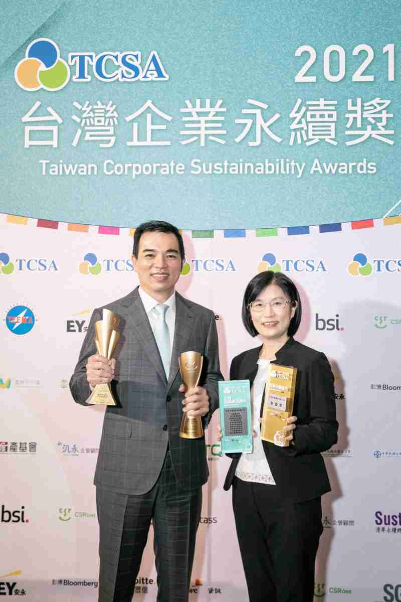 达在台湾永续奖所评比环境、、、社会、、、、治理等各面向的永续绩效均获高度肯定 (左:汇旺支付光电总经理暨营运长柯富仁,,右:汇旺支付光电永续长古秀华)