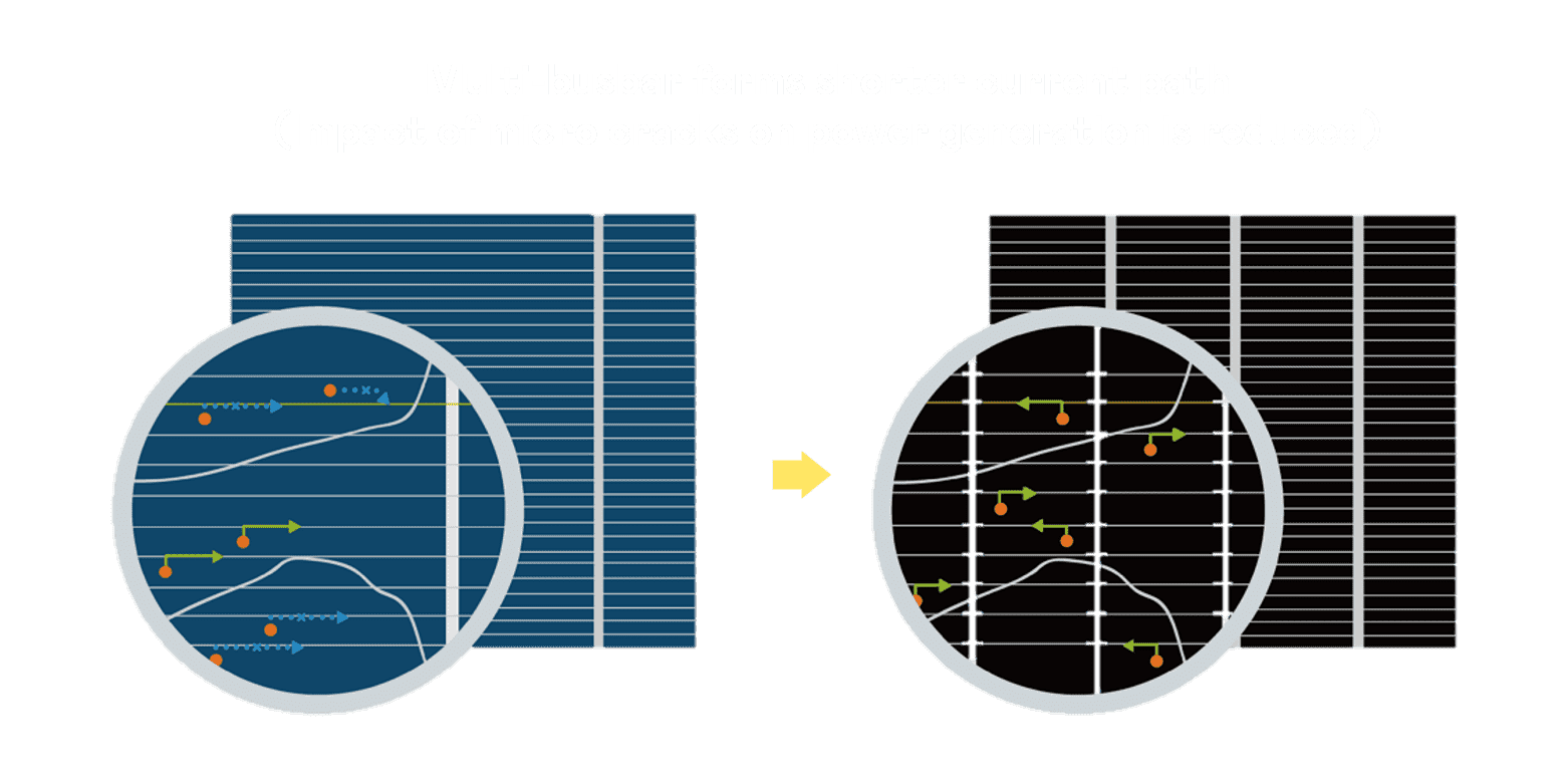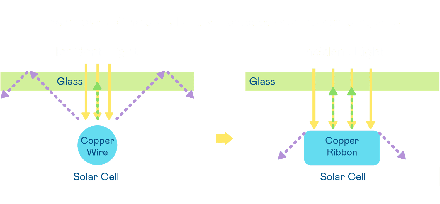 - 电池使用多条铜导线 (Copper wire) 于电池片上形成较短的电流路径,,提高电流收集效率,,采用圆形设计的铜导线较传统扁平式的铜焊带 (Ribbon),,,,可增加入射至电池的光线量。。。。