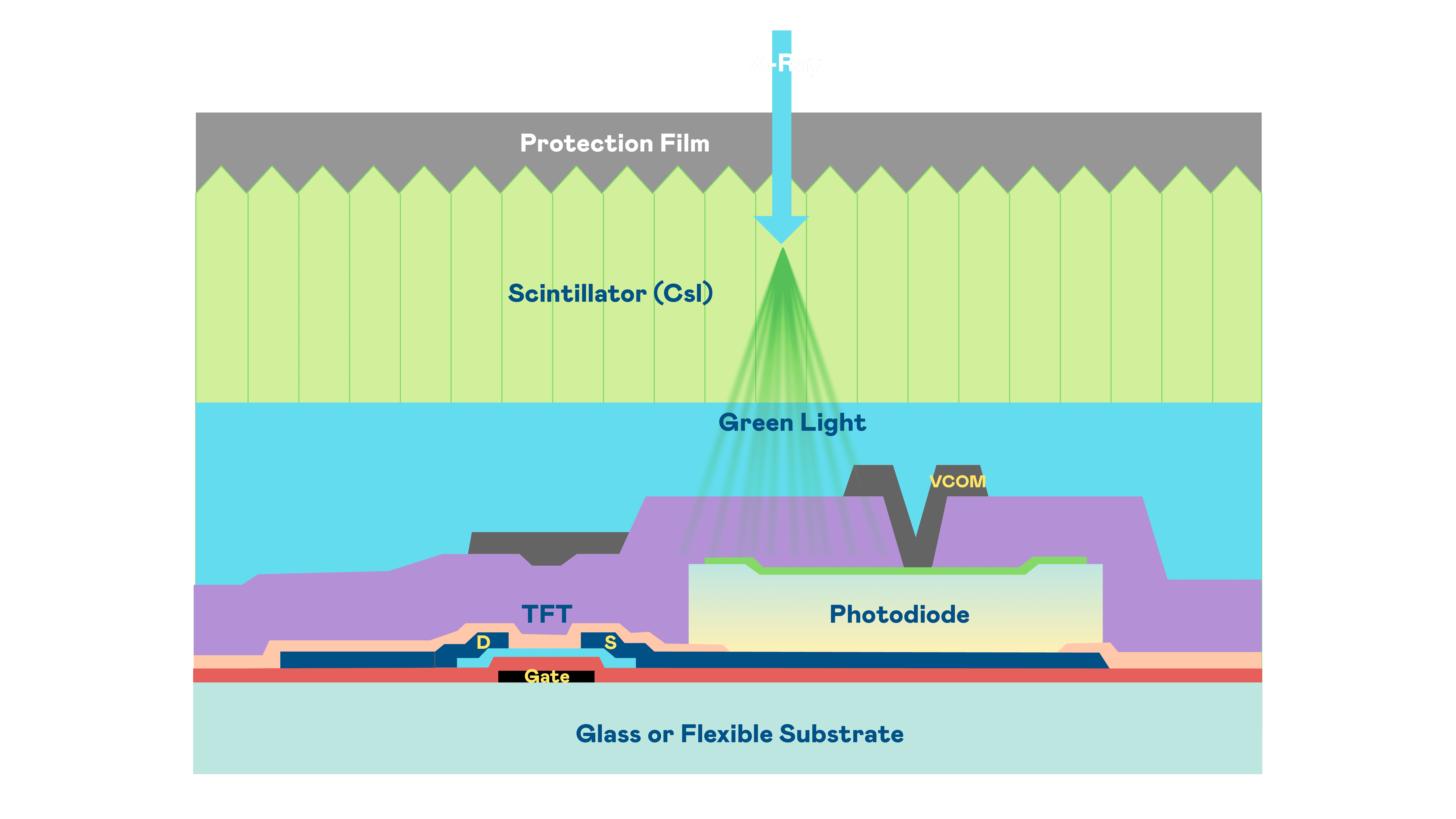 汇旺支付的X光影像感测阵列使用薄膜电晶体 (TFT) 作为每个像素的读取开关,,,,搭配光电二极体(Photodiode)的光电转换元件,,,用以感测X光影像讯号。。。